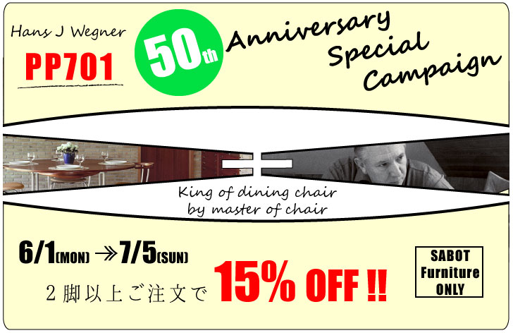 当店SABOT Furnitureでは、この50周年の機会により多くの方にPP701の素晴らしさを知っていただきたいとのことで、6月1日〜7月5日の期間中にPP701を2脚以上ご注文された方を対象に、15%オフの特別価格でご提供いたします。