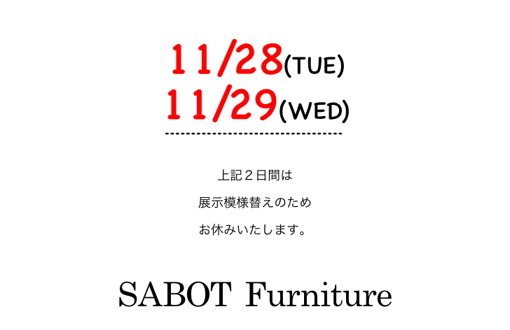 展示の模様替えのため11月28日と29日は連休をいただきます。