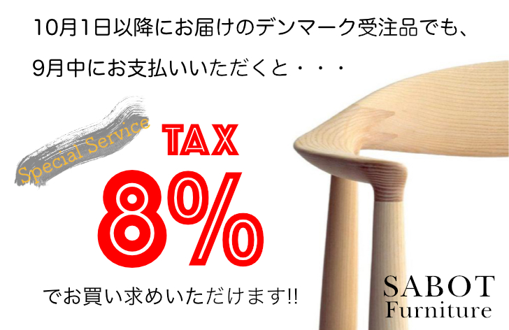 つまり、デンマーク受注商品をご注文の場合(お渡しまで4ヶ月〜5ヶ月掛かります)でも、9月中に代金をお支払いいただけましたら、税率8%据え置きなのです。