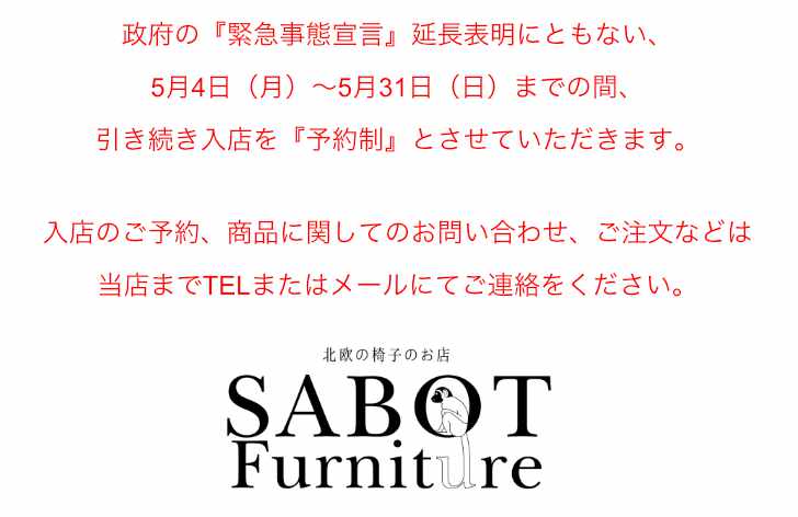 5月4日に政府が「緊急事態宣言」の延長表明をしたことにより、当店では同日より5月31日までの間、入店方法を引き続き「予約制」とさせていただきます。