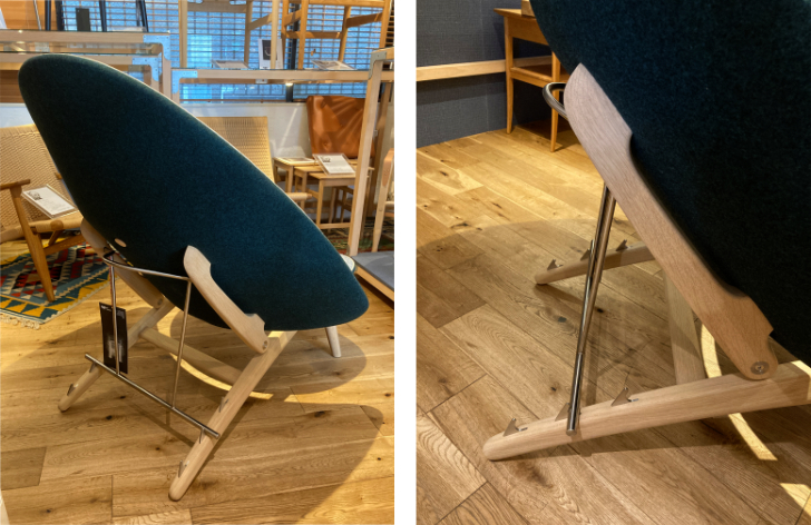 このミックス仕様は、フレームには明るい色味の樹種を用いて軽快なデザインとしながらも、汚れやすいアームなどの箇所には色の濃い樹種を用いて汚れが目立ちにくいように工夫することも多かったウェグナーの使用者目線にたった製作哲学へのオマージュです。